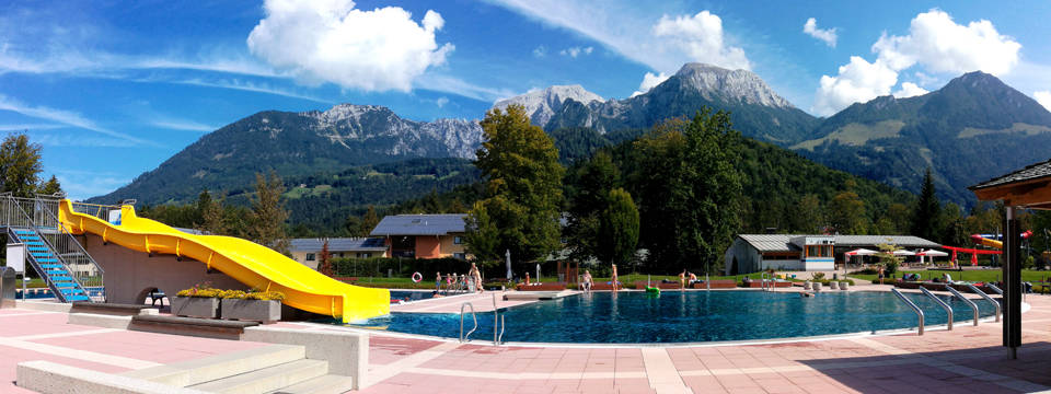 Sprungturm, Breitwasser- und Großwasserrutsche - das Schornbad in Schönau a. Königssee bietet Badespaß für Groß und Klein. Die großzügig angelegten Grünflächen lassen genug Platz zum Sonnen und Spielen. Auf über 900 m² Wasserfläche bietet das Bad eine Breitwasser- und eine Großwasserrutsche. Außerdem gibt es einen Kiosk mit Gästeterrasse.