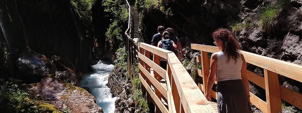 Wildromantisches Tal dem Watzmann zu Füßen-Am Eingang des gewaltigen Hochtals zwischen Watzmann und Hochkalter im Bergsteigerdorf Ramsau liegt eine enge Schlucht: die Wimbachklamm. Während das hintere Wimbachtal, das sogenannte Wimbachgries, von trockenem Schotter bedeckt ist und das Wasser unterirdisch fließt, kommt das Wasser des Wildbaches in der Wimbachklamm mit lautem Getöse an die Oberfläche und stürtzt in steilen Wasserfällen in die enge Felsenschlucht. Brücken und Stege an den steilen Felsen ermöglichen eine Wanderung durch die Wimbachklamm.