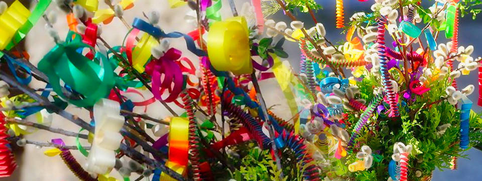 Der Palmsonntag bringt erste Farbtupfer - Palmweihe am Sonntag vor Ostern. In den Wochen vor Ostern finden in Berchtesgaden und im Rupertiwinkel umfangreiche Vorbereitungen in den Familien und auf den Bauernhöfen statt. Die Väter schneiden Weidenäste, besorgen Zweige und binden die "Palmbuschen", die Mütter und größeren Kinder basteln den Palmschmuck aus "Gschobertbandln", gefärbten Hobelspänen, die im Gedenken an den Einzug Jesu in Jerusalem, noch heute am Palmsonntag von den Kindern zur Kirche getragen und dort gesegnet werden.